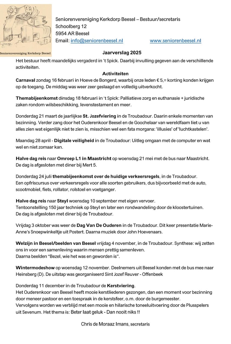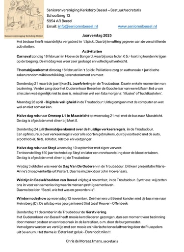 De vereniging staat bekend om haar bruisende en gevarieerde activiteitenaanbod. Door het jaar heen worden er tal van gezellige, leerzame en verbindende momenten georganiseerd, speciaal gericht op het samenbrengen van mensen en het stimuleren van actief meedoen. Het programma bestaat uit twee hoofdcategorieën: terugkerende activiteiten en grotere, bijzondere activiteiten. Samen zorgen zij voor een levendige agenda waar iedereen iets van zijn of haar gading in kan vinden.